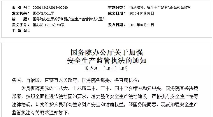 为贯彻落实党的十八大、十八届二中、三中、四中全会精神和党中央、国务院有关决策部署,按照全面推进依法治国的要求,着力强化安全生产法治建设,严格执行安全生产法等法律法规,切实维护人民群众生命财产安全和健康权益,经国务院同意,现就加强安全生产监管执法有关要求通知如下: